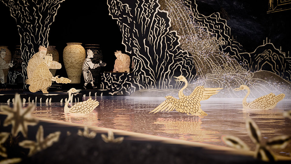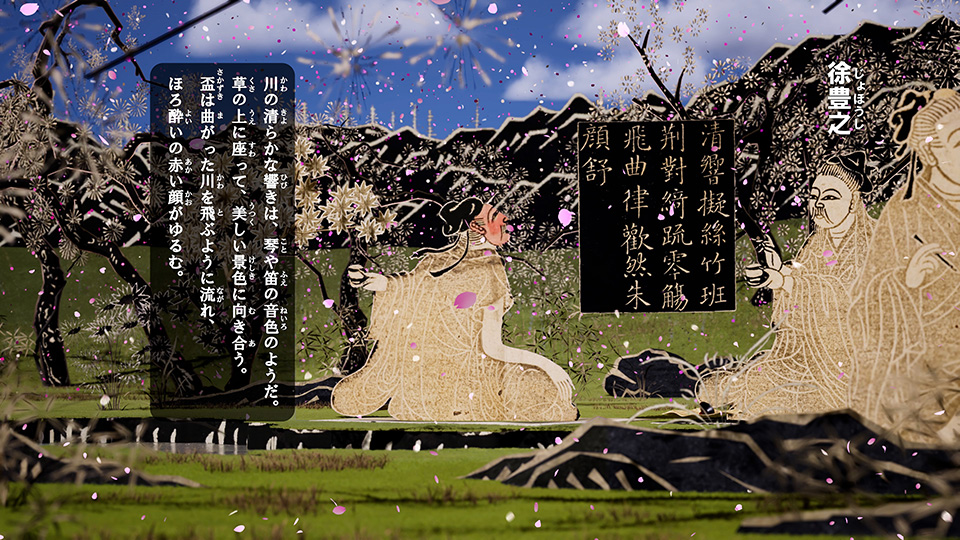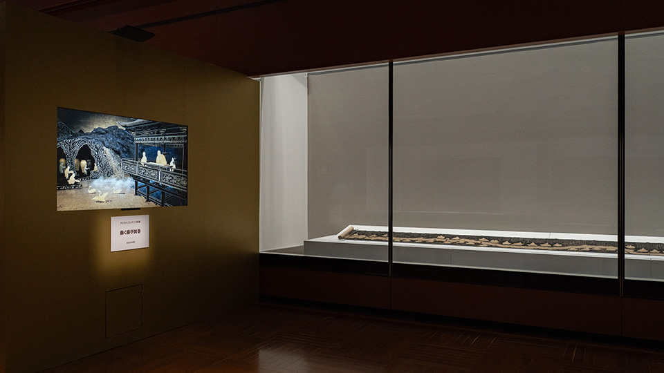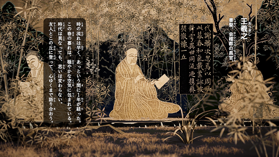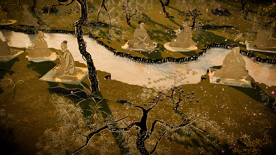 特別展「九州の国宝 きゅーはくのたから」において、九州国立博物館所蔵の、「蘭亭図巻(永楽本)」を題材にした3D映像を制作しました。本作では3Dリアルタイムレンダリング技術を活用し、静止した絵巻に動き、奥行き、色の演出をすることにより、絵巻の世界観に没入できるように演出しています。